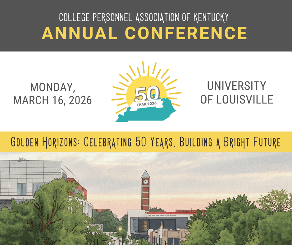 SAVE THE DATE: The College Personnel Association of Kentucky (CPAK) is excited to announce its 2026 CPAK Conference, marking the 50th anniversary of CPAK's commitment to advancing student affairs in Kentucky. Join us as we celebrate the past, reflect on our journey, and envision a bright future for higher education across the Commonwealth. The conference will be hosted at the University of Louisville in Louisville, Kentucky on Friday, March 16, 2026. More information about the call for programs, conference schedule, transportation and lodging, and CPAK Hall of Fame are forthcoming, but be sure to save the date on your calendar!